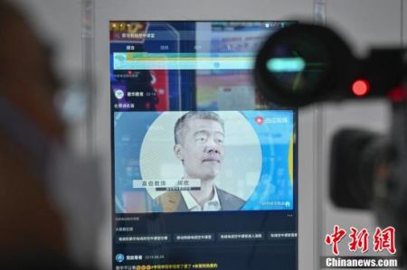 2月27日,歌华有线公司内业务展示厅的大屏正在播放由清华附中朝阳学校高级教师周欣录制的“名师讲名著”课程。 中新社记者 张兴龙 摄