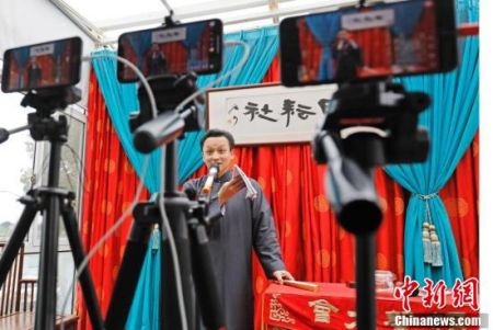 3月1日,上海青年相声、快板书演员赵松涛在家中网络直播公益讲座《相声中国风》。在3月1日至7日连续7天,他将运用抖音、微博、B站的网络直播平台,与民众相约网络,聊聊相声、快板、《子曰》和16年上海创业的故事。 中新社记者 殷立勤 摄