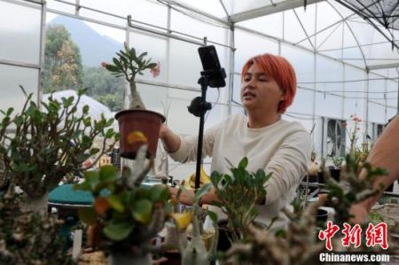 面对新冠肺炎疫情,福建省漳州市龙海双第华侨农场多措并举“提速”复工复产,对已复工、拟复工企业疫情防控采取清单式管理。截至3月1日,农场内的17家企业,已复工11家,复工总人数318人。乡下人园艺有限公司是该农场比较早复工的企业,图为2月27日,工人在线上直播销售植物盆栽。 中新社记者 张金川 摄