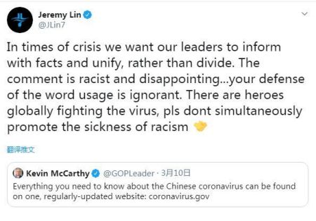 目前效力于CBA北京首钢队的球星林书豪怒怼道:“危机时刻,我们希望领导人能用事实说话,团结而不是分裂民众。这是种族主义言论,令人失望。你对这个词用法的辩护是无知的。全世界都有抗击病毒的英雄,请不要在宣传他们的同时推广种族歧视的恶疾。”
