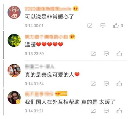 很多网友在微博下留言,“我们国人在外互相帮助真是太暖了!” “真的是善良可爱的人”,还有网友感慨:中国人无论到了哪里,都能团结一心共渡难关!