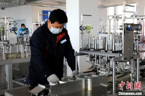 山东德启智能科技有限公司内,工人正在组装口罩机。 李欣 摄从工业打印机领域翘楚到口罩、口罩机生产行当“新兵”,中国侨商会监事长、美国华人企业家联合会会长、德迈国际产业集团有限公司董事长施乾平所带领的团队用30余天完成了口罩、口罩机企业的筹备、量产。
