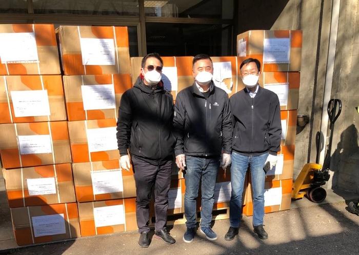 米兰华助中心执行主任周建煌、米兰华侨华人工商会名誉会长李秀桐、秘书长朱金亮运送国内捐赠的防疫物资。(受访者供图)(抗击新冠肺炎)侨胞留守住在国 携手互助共抗疫