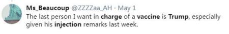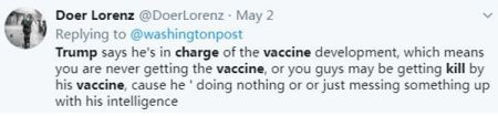有网友说,特朗普称他负责疫苗的研发,这意味着“你永远不会接种到疫苗,或者可能会被他的疫苗杀死。因为他要么什么都不做,要么就把事情搞砸”。
