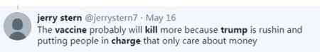 网民jerry stern说,因为特朗普的仓促行事和“让只关心钱的人负责疫苗生产,疫苗可能会杀死更多的人”。