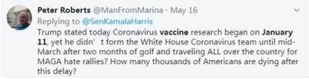 网民Peter Roberts说:“特朗普今天表示,新冠病毒疫苗研究于1月11日开始,但他在打了两个月的高尔夫球,并在全国各地参加‘让美国再次伟大’集会后,直到3月中旬才组建了白宫疫情应对小组。耽误了这么久后,有多少美国人死亡?”