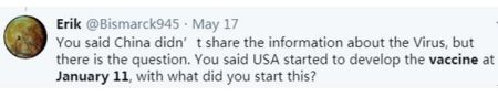 网民Erik表示:“你说中国没有分享有关病毒的信息,但问题是美国在1月11日已开始研制疫苗,你又做了什么呢?”