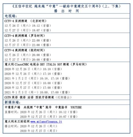 2020年是中国和意大利正式建立外交关系50周年。为纪念两国建交并彰显中意关系的蓬勃稳健发展,由中央广播电视总台与意大利克拉斯传媒集团合作拍摄的纪录片《互信半世纪 越来越“中意”——献给中意建交五十周年》12月26日和27日在总台央视中文国际频道、中意平台、意大利ClassCNBC电视台、意大利MilanoFinanza网等中意媒体平台同步首播。