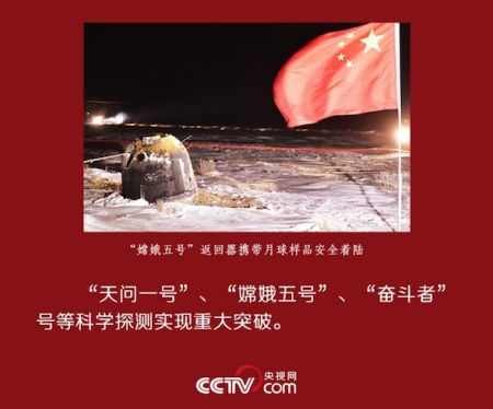 如今,时间的指针指向2021年,我们完成了新时代脱贫攻坚目标任务,全面建成小康社会取得伟大历史成果;“十三五”圆满收官,我国在世界主要经济体中率先实现正增长;粮食丰收、“嫦娥”奔月;克服疫情影响、抵御洪涝灾害……