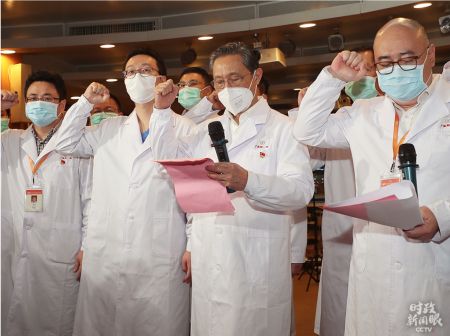 △2020年3月2日,广州医科大学附属第一医院,钟南山院士(右二)在首批战“疫”一线火线发展党员的入党宣誓仪式上领誓。