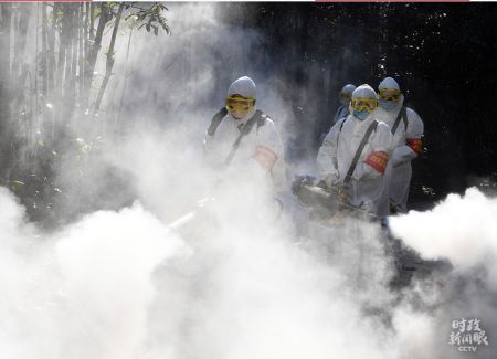 △2020年2月,安徽亳州市,环卫党员突击队队员对社区进行防疫消杀。