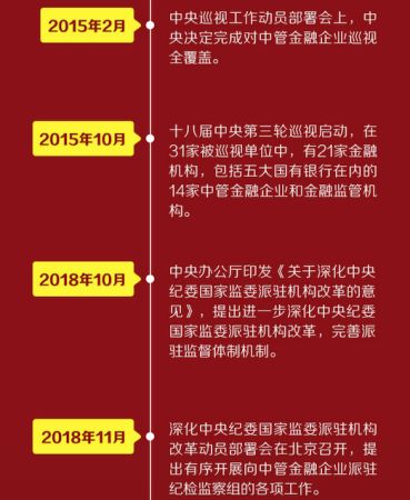 2019年十九届中央纪委三次全会透露,中管金融企业内设纪委改为中央纪委国家监委派驻机构。