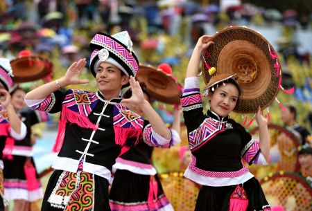 △2020年5月,广西环江毛南族自治县退出贫困县序列,毛南族实现整族脱贫。这是2017年11月18日,广西环江毛南族自治县群众载歌载舞,喜迎30年县庆。