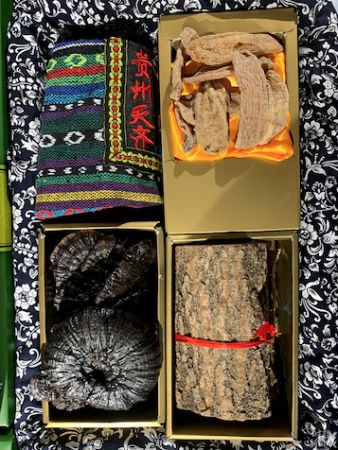 △贵州三宝,右上为天麻,下方分别是灵芝、杜仲。(总台央视记者王鹏飞拍摄)