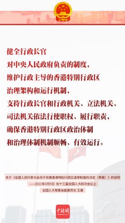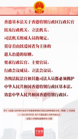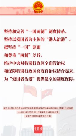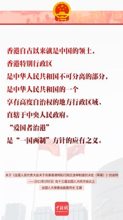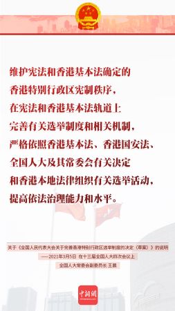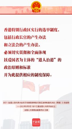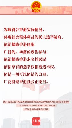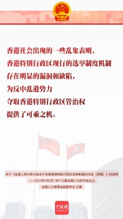 十三届全国人大四次会议3月5日开幕,全国人民代表大会常务委员会副委员长王晨,在会上作了关于《全国人民代表大会关于完善香港特别行政区选举制度的决定(草案)》的说明。说明中这些关键表述,引人关注——