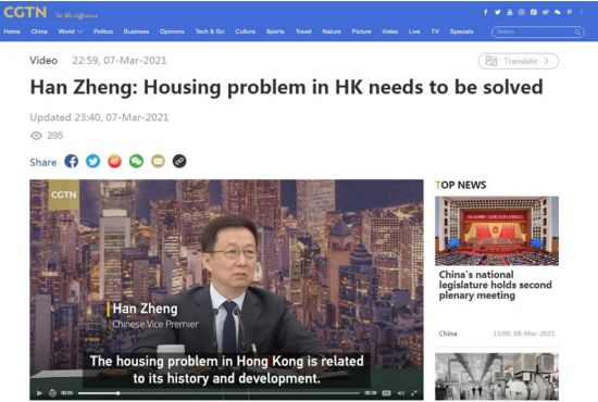 中国国际电视台(CGTN)7日发布了韩正与香港代表团会面的片段。在讲话中,韩正提到了完善香港特区选举制度、香港金融中心发展、香港住房问题等外界关注的议题。