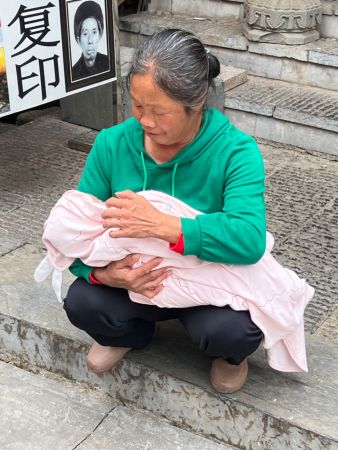 在青岩古寨镇、下司古镇寨和陂鼐古寨,我留意到人们对孩子的爱有他们更朴素的情感,他们看儿童的目光更为温暖。经常能看到背着孩子的妇女,在她们劳作的时候,孩子一直被背在身上,婴儿感知母亲身体的温度,能安详地熟睡,我没有听到小孩的哭声。背孩子用一块绣花的布,上下缝着布做的长带。所以,贵州的女人对孩子的爱表现在刺绣的背带上,一针一线都是他们对晚辈的呵护。