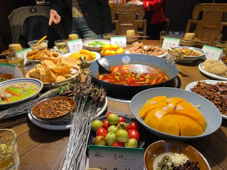 贵州的菜不很辣,每顿饭在桌上每人有个小碗,里面装着辣椒粉和其他香料,叫蘸水,往小碗里加一点汤,菜肴粘上蘸水,增添美味与辣味。因此不食辣椒的人可以轻松吃菜。贵州的香肠腊肉都非常好吃,豆腐也有各种吃法。也许因为食材是本地的,因此觉得这里的菜格外好吃,不论蔬菜还是豆腐,不论肉还是鱼。