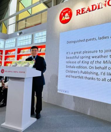 斯里兰卡悦读出版社社长普拉迪·甘姆奇,回顾了苏少社与其公司在生态文明图书领域的合作历程。此前在伦敦书展期间,双方共同见证了苏少社“童心筑梦·美丽新时代”书系僧伽罗文版的首发,苏少社用儿童视角讲述生态文明中国故事的巧思,与斯里兰卡珍视自然、守护家园的文化理念高度契合。此后双方顺利合作“金山银山·我和自然”系列,这些绘本在斯里兰卡小读者中引发了共鸣,为引进《麋鹿大王》奠定了信任基础。最后,他从《麋鹿大王》内容价值、艺术特点、未来合作三个方面分享了合作的意义。